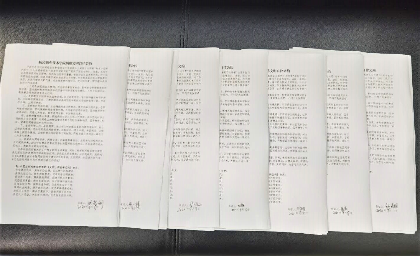 活动中,学院印发“争做中国好网民”倡议书和网络安全宣传周相关资料,利用树立宣传板、发放资料进教室、课堂、饭堂等形式,号召全院师生健康上网、文明上网、理性上网,争做中国好网民同时,同学们以班为单位签订杨凌职业技术学院网络文明自律公约承诺书,共同立下庄严承诺。