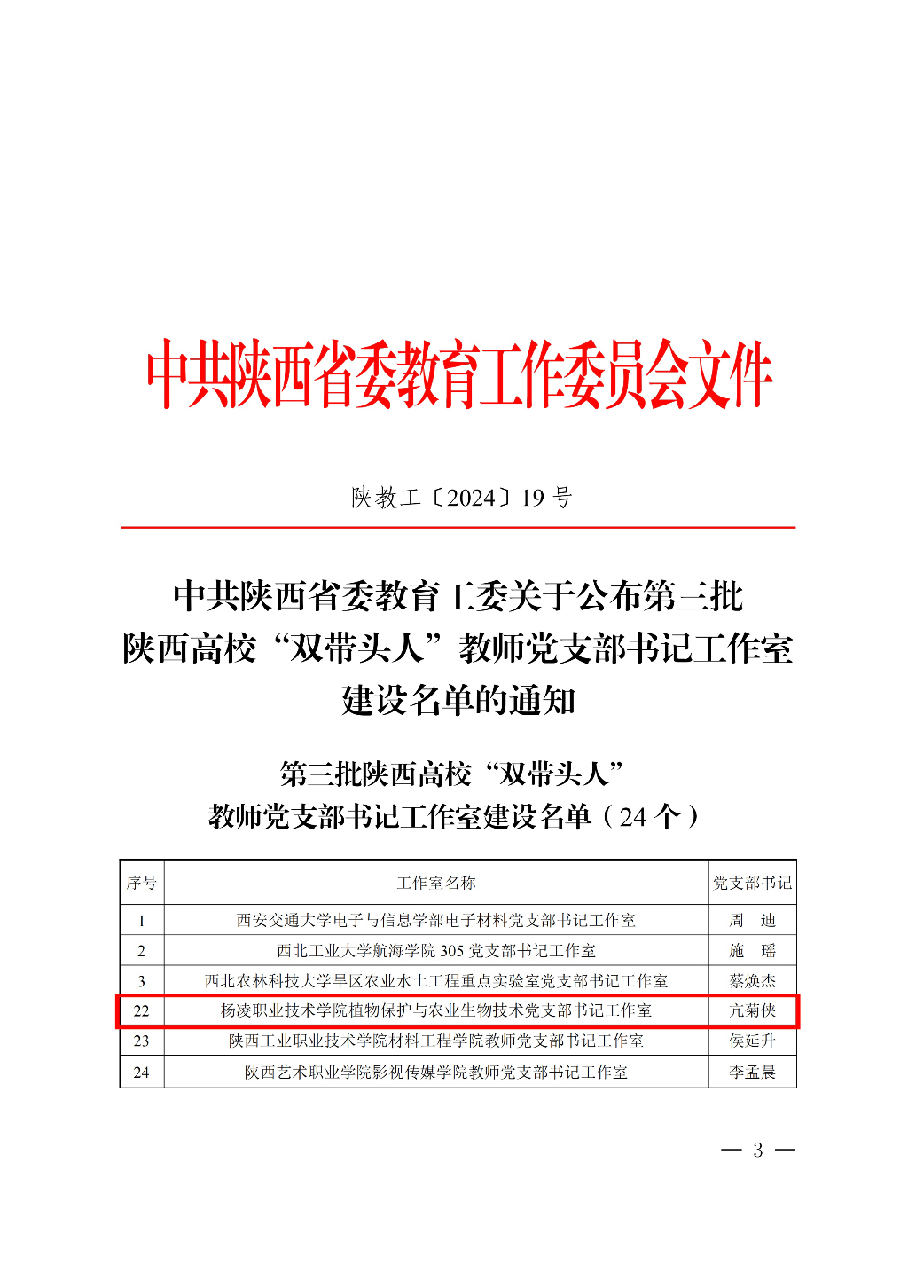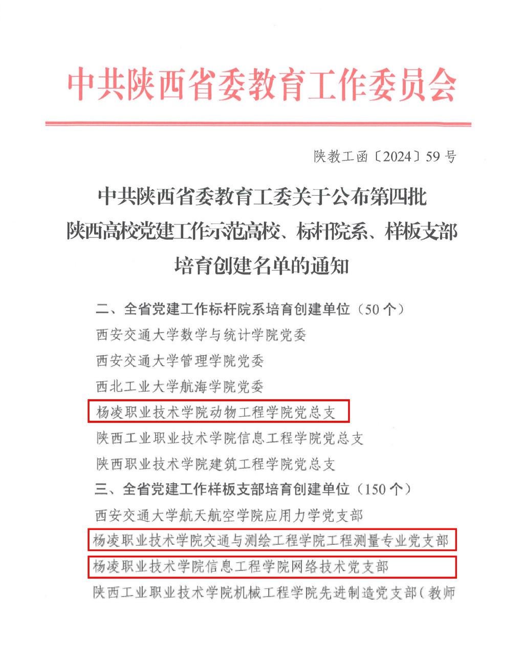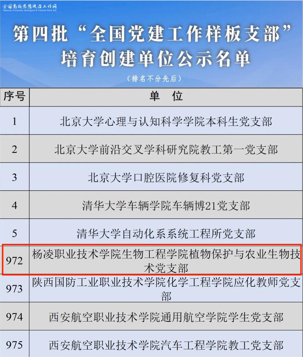 近日,教育部对全国第四批新时代高校党建示范和质量创优结果进行了公示,省委教育工委公布了全省第四批新时代高校党建示范和质量创优结果和第三批陕西高校“双带头人”教师党支部书记工作室建设名单。我校生物工程学院植物保护与农业生物技术党支部入选“全国党建工作样板支部”;动物工程学院党总支入选“全省党建工作标杆院系”;交通与测绘工程学院工程测量党支部、信息工程学院网络技术党支部入选“全省党建工作样板支部”;生物工程学院植物保护与农业生物技术党支部书记工作室入选陕西高校“双带头人”教师党支部书记工作室建设名单。