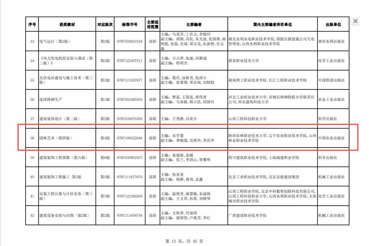 11月3日,第二届全国教材建设奖评选结果公示,此次评选全国共拟表彰优秀教材989种。我校生态环境工程学院衣学慧教授主编的《园林艺术》(第四版)、张君超副教授主编的《园林植物栽培养护》(第3版)两部教材,获全国教材建设奖(职业教育与继续教育类)二等奖。