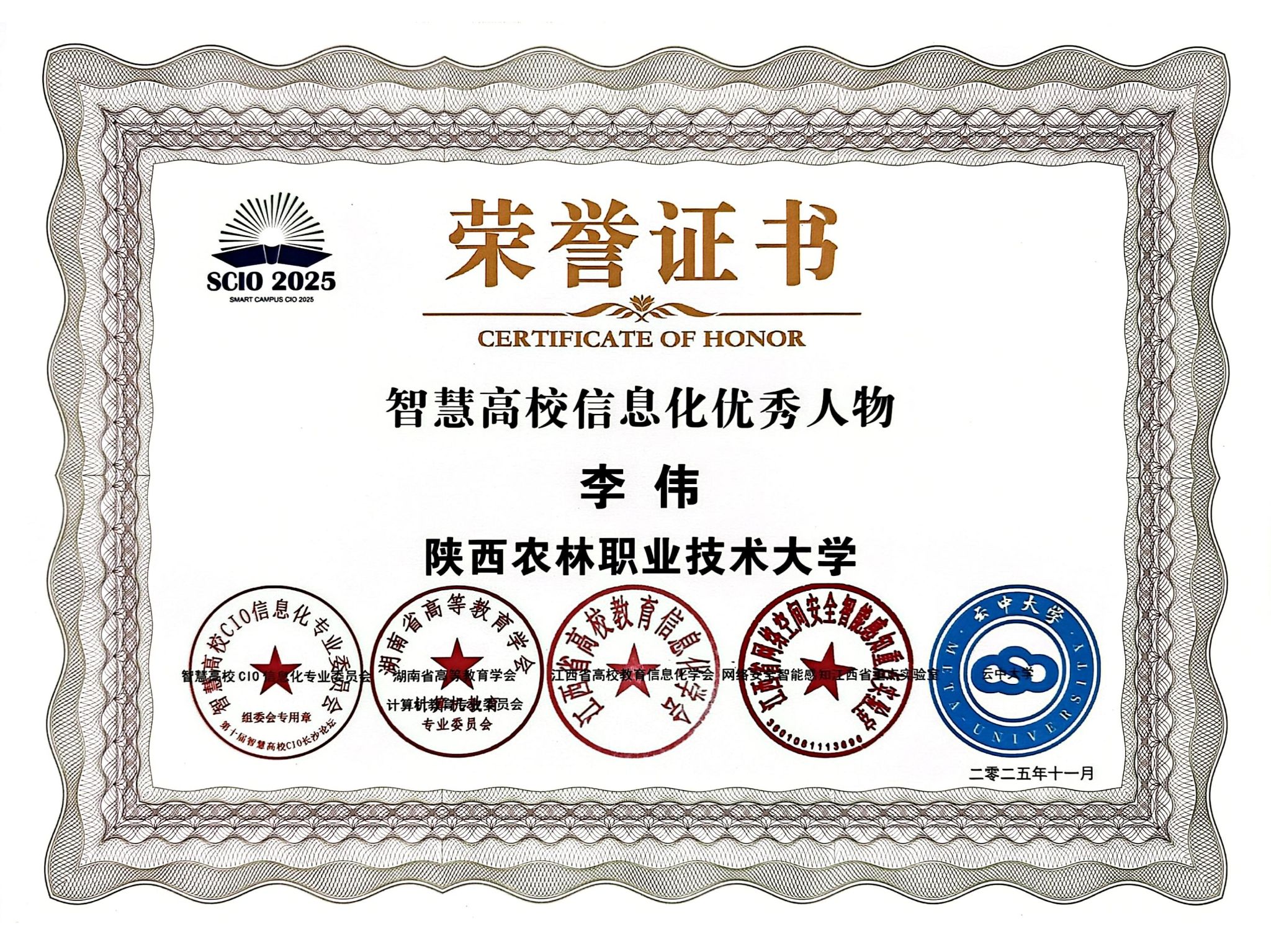 11月20日,第十届智慧高校CIO论坛在湖南长沙举办,我校凭借智慧校园建设的突出成效,斩获“智慧校园-示范高校”集体荣誉,信息化建设与管理处夏浩军、李伟分别获评“智慧高校信息化突出人物”“智慧高校信息化优秀人物”。
