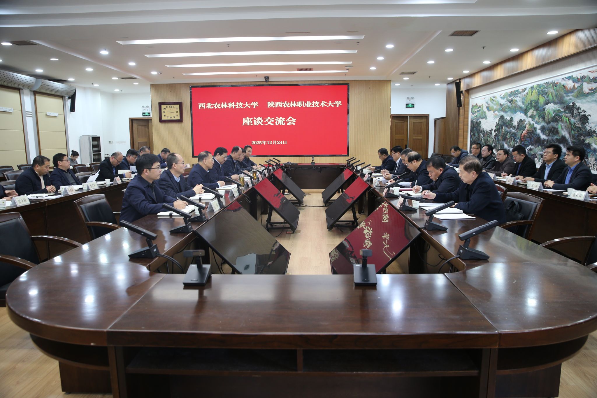 1223日,党委书记韩明军,校长仲伟周行赴西北农林科技大学交流座谈西北农林科技大学党委书记黄思光出席座谈会,常务副校长韦革宏主持会议学校党委副书记刘瑞明王勇胜,党委副书记、纪委书记、监察专员康强副校长祝战斌西北农林科技大学党委副书记、纪委书记、监察专员陈红,党委副书记闫祖书,副校长房玉林,党委副书记庄世宏,副校长孙马、马闯等领导班子成员参加座谈会。