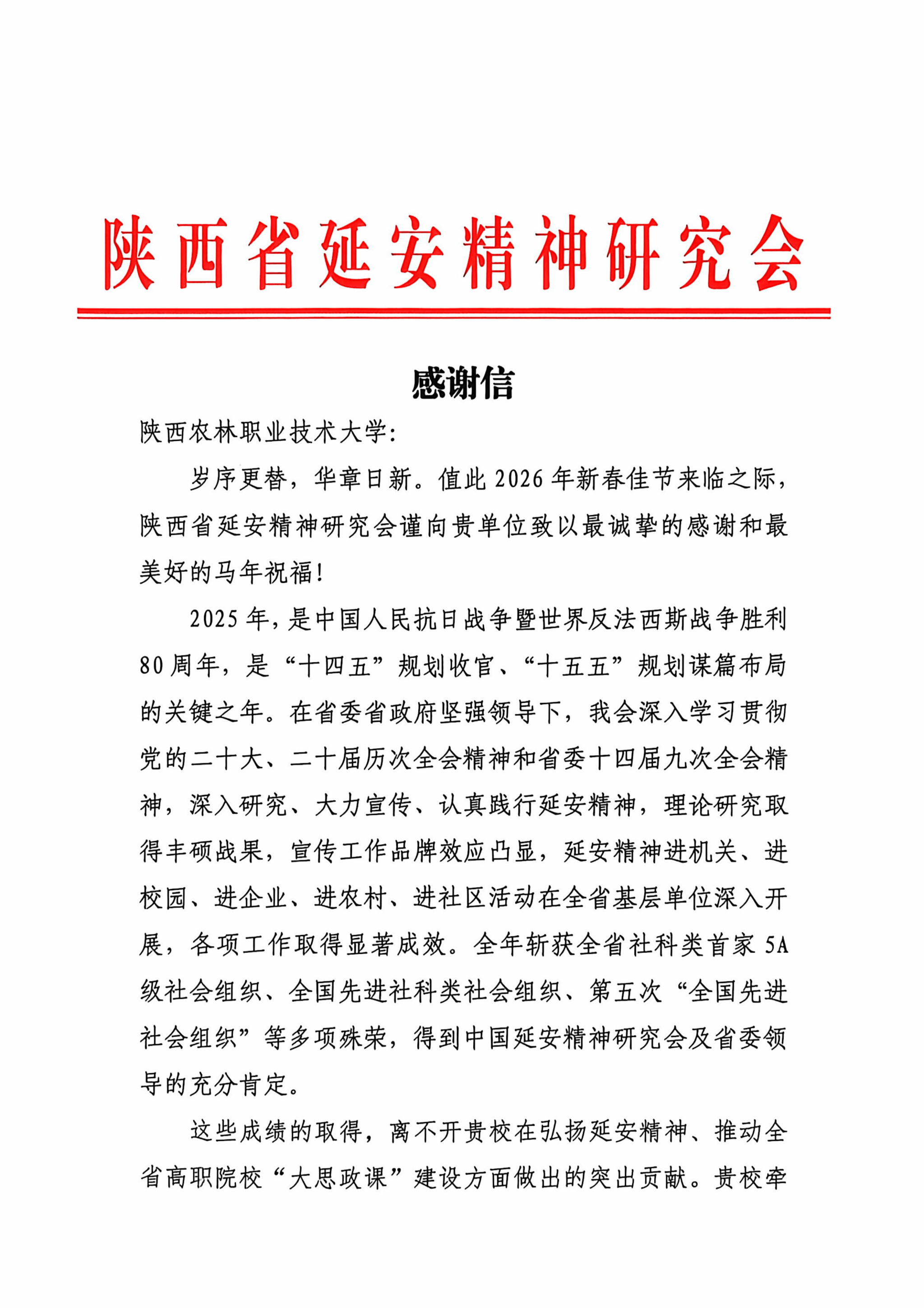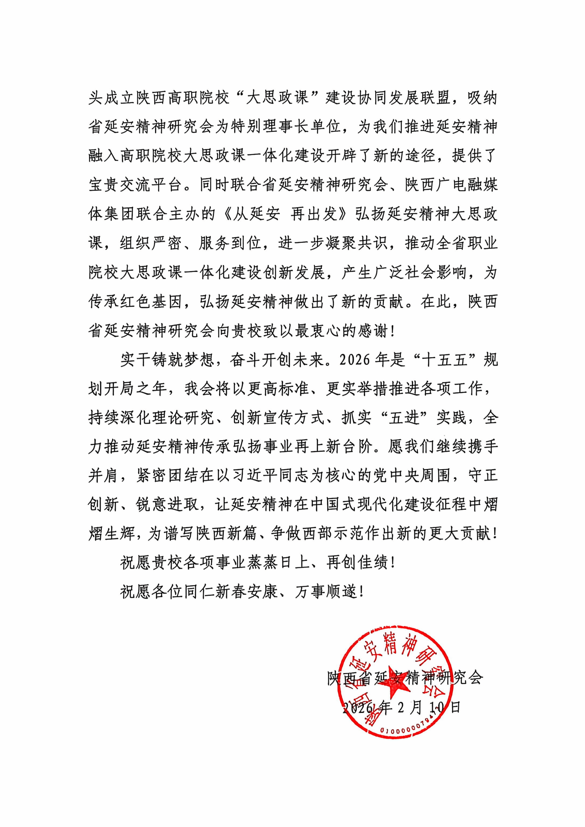 2月10日,学校收到陕西省延安精神研究会发来感谢信对学校致以诚挚感谢和美好祝福,高度肯定学校在弘扬延安精神、推动全省高职院校“大思政课”建设中的突出贡献。