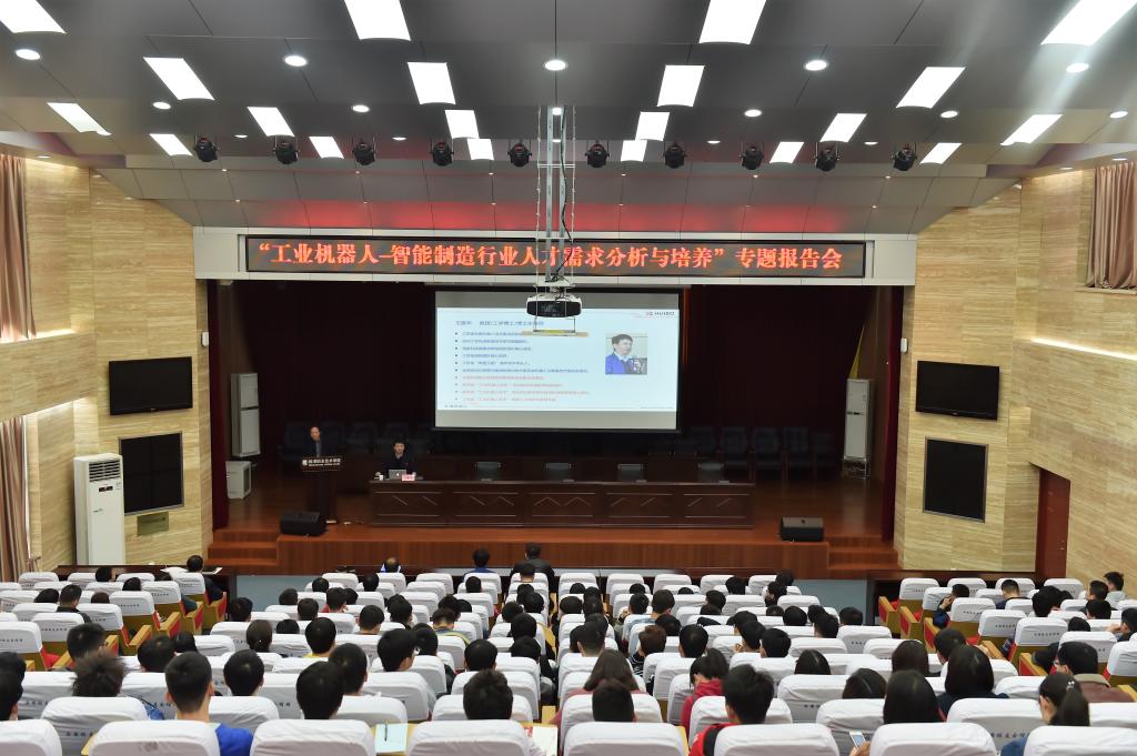 签约仪式结束后,王振华在思辩堂作了题为《工业机器人、智能制造行业人才需求分析与培养》的学术讲座。报告介绍了我国人工智能的基本要素、发展阶段和价值,并以高职为例,分析了工业机器人行业专业岗位的需求、建设体系人才需求与专业建设现状,提出了机器人专业建设整体方案,全方位解读了工业机器人、智能制造行业人才培养的关键问题。机电工程分院教师及学生300余人聆听了报告。