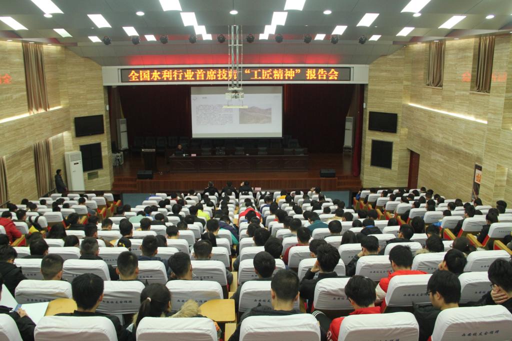 下午,全国水利行业首席技师“工匠精神”报告会在醒钟楼思辨堂举行,报告会主题为“传承工匠精神,弘扬水利行业精神”,张淮武、石小庆、金天龙3位技能导师分别作了题为《渡槽伸缩缝止水处理方法》《传承工匠精神》《不忘初心,满怀信心,下定决心,为实现自己的梦想走好每一步》的报告会,水利工程分院一、二年级三百余名学生聆听了报告会。