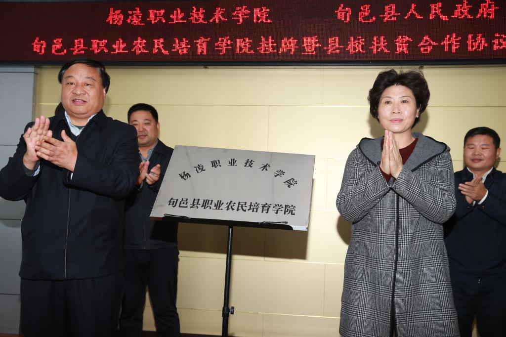 在旬邑县职业农民培育学院挂牌暨县校扶贫合作签字仪式上,李晓静与王周锁共同为我院旬邑县职业农民培育学院揭牌,任得元与张勇代表双方签订了《关于加强产学研结合促进经济发展的合作协议书》。