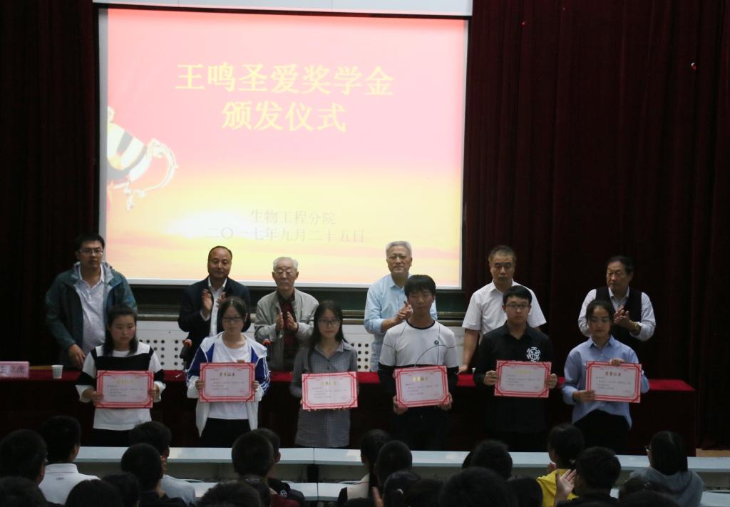 颁发仪式上,赵曼、王鸣、刘怀省以及生物工程分院负责人共同为今年评选出的6名同学颁发了奖学金和荣誉证书。获得奖学金的学生代表通过献花和发言表达了对王鸣教授崇高的敬意和感激之情,并表示要以实际行动来回报这份关心和帮助。随后,王鸣教授为大家带来一场《向下扎根,向上结果》的励志报告,分享了他从事科研以及慈善公益事业的经历和感受,精彩的报告深深地感染了在场的每一位师生。