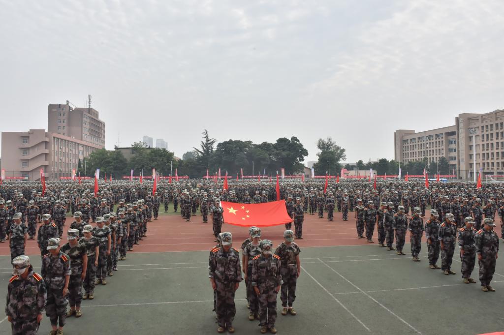 9时50分,南校区参加军训的3000余名新生停止训练,在南校区操场整齐列队。各连连旗迎风招展,各个方队雄壮威武,气势如虹。100余名新生组成“9.18”、“勿忘国耻”两个造型,四名旗手高擎国旗居于其中。10时整,防空警报响起,在场全体人员肃立默哀。警报结束后,军训教官带领与会师生郑重宣誓“勿忘国耻,我辈自强”,3000余人齐声高呼,响彻云霄。