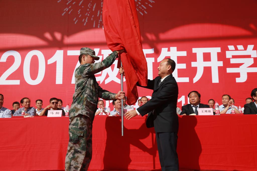 9月11日上午9时,伴随着雄壮的国歌声和冉冉升起的五星红旗,我院2017级新生开学典礼暨军训动员大会在南校区田径场隆重举行。学院党委书记赵曼向军训团授旗,党委副书记、院长王周锁作讲话。开学典礼暨军训动员大会由副院长张迪主持。