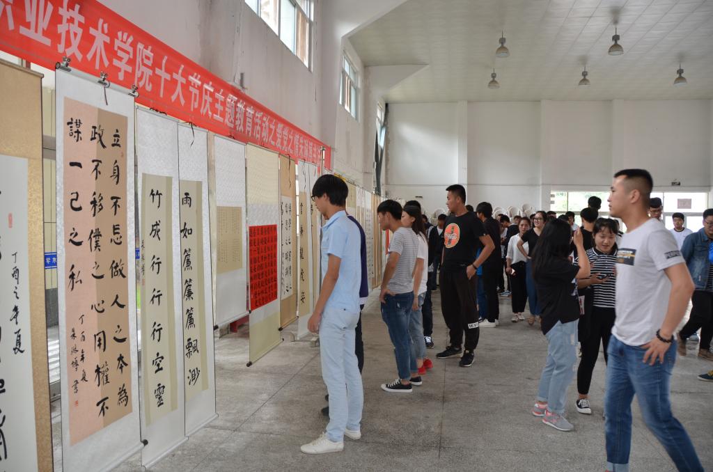 为喜迎党的十九大胜利召开,展示学院“四位一体”素质教育成果6月5日下午,由学院团委和书画艺术中心主办、动物工程分院团总支承办的“党在我心中喜迎十九大“十大节庆主题教育活动之爱党之情”朱琳博书法作品展在南校区一卡通中心举行
