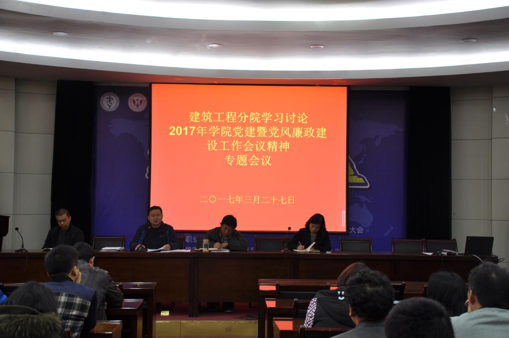 3月27日下午,建筑工程分院在水韵楼二楼报告厅组织召开了分院全体师生党员及教职工会议,传达学院2017年党建暨党风廉政建设会议精神,学习讨论赵曼书记及王周锁院长等领导讲话精神。