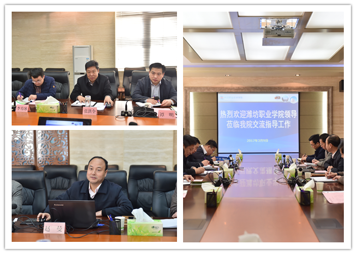 赵曼代表学院对兄弟院校来访表示欢迎,并从学院历史沿革、办学理念、师资队伍建设、招生就业、国际交流、科研推广等方面简要介绍了我院的基本情况。张洪全对我院的热情接到表示感谢,并介绍了潍坊职业学院的发展历史、办学理念、优质校建设及新校区建设基本情况。随后,双方就学院体制机制、专业建设、师资队伍、产学研与社会服务、信息化教学、国际交流合作、校园文化建设等方面先进经验与做法进行了深入交流。