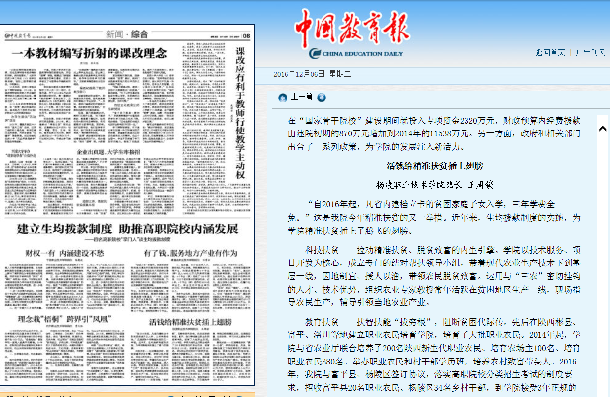 12月6日,《中国教育报》8版“四名高职院校‘掌门人’谈生均拨款制度”专栏刊发了我院王周锁院长署名文章《活钱给精准扶贫插上翅膀》,全文刊载如下(详情进入):