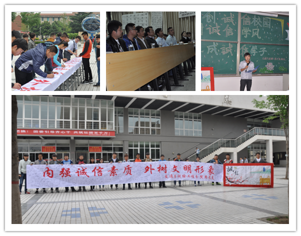 一是在水善厅前举行了“內强诚信素质 外树文明形象”签字活动。通过宣传海报、问卷调查、咨询路人有关诚信的问题并在写着诚信标语的横幅上签字,了解全体师生对诚信的看法,宣传诚信,倡导诚信,引起大家对诚信的广泛关注。二是举行了“创诚信校园,树诚信学风,成诚信学子”主题演讲比赛。选手们尽情畅谈着自己对诚信的理解,有的引经据典,有的用一些当代名人的成功事例,有的用发生在自己身边的事情,无不阐述着自己对诚信的认识。选手们的精彩发言,渲染着在场的每一个人,活动现场掌声此起彼伏。