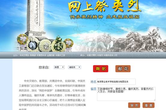 4月1日至5日,为弘扬革命先烈优秀品质,激发现代青年学生努力奋斗,信息工程分院组织各团支部、学生社团通过手机、电脑等终端登录“中国文明网”积极参与到覆盖全国的“网上祭英烈”活动当中。