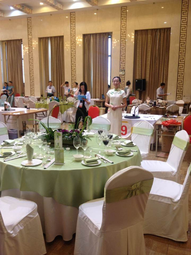 名学生参加。竞赛内容以中餐主题宴会设计为主线,含盖台面创意设计、菜单设计、餐巾折花、中餐宴会摆台、斟酒、英语口语、专业理论、现场评析等内容。竞赛项目主要考查选手的设计创新能力及专业操作能力,以及学生在产品创新、现场问题的分析与处理、卫生安全操作等方面的职业素养。