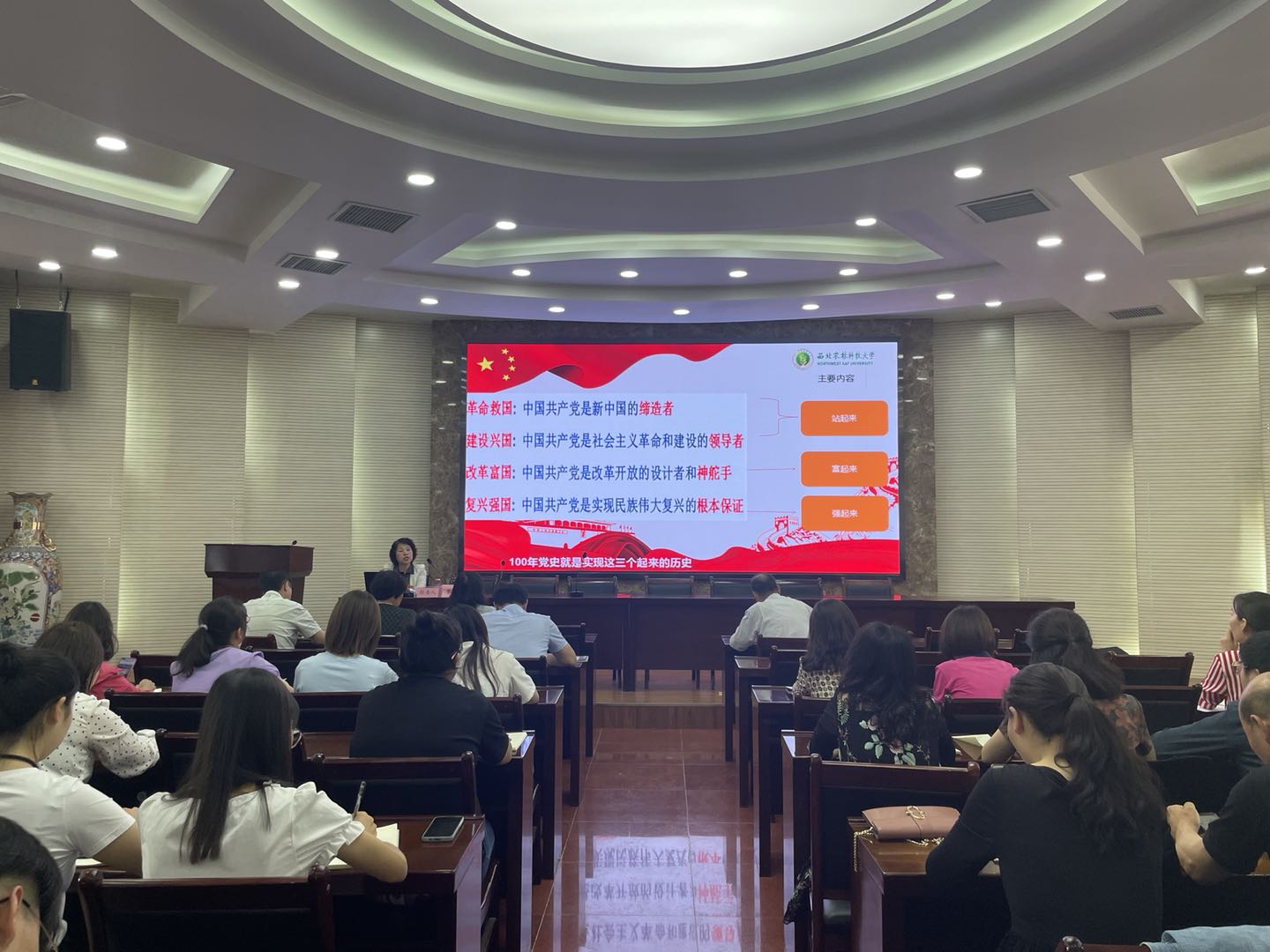 5月28日,旅游与管理学院在南校区水韵楼二楼报告厅举行党史学习教育专题报告会,邀请西北农林科技大学马克思主义学院教授李晓娥作题为《中国共产党百年辉煌——庆祝中国共产党成立100周年》的报告。该院全体教师、学生党员共50余人聆听了报告。