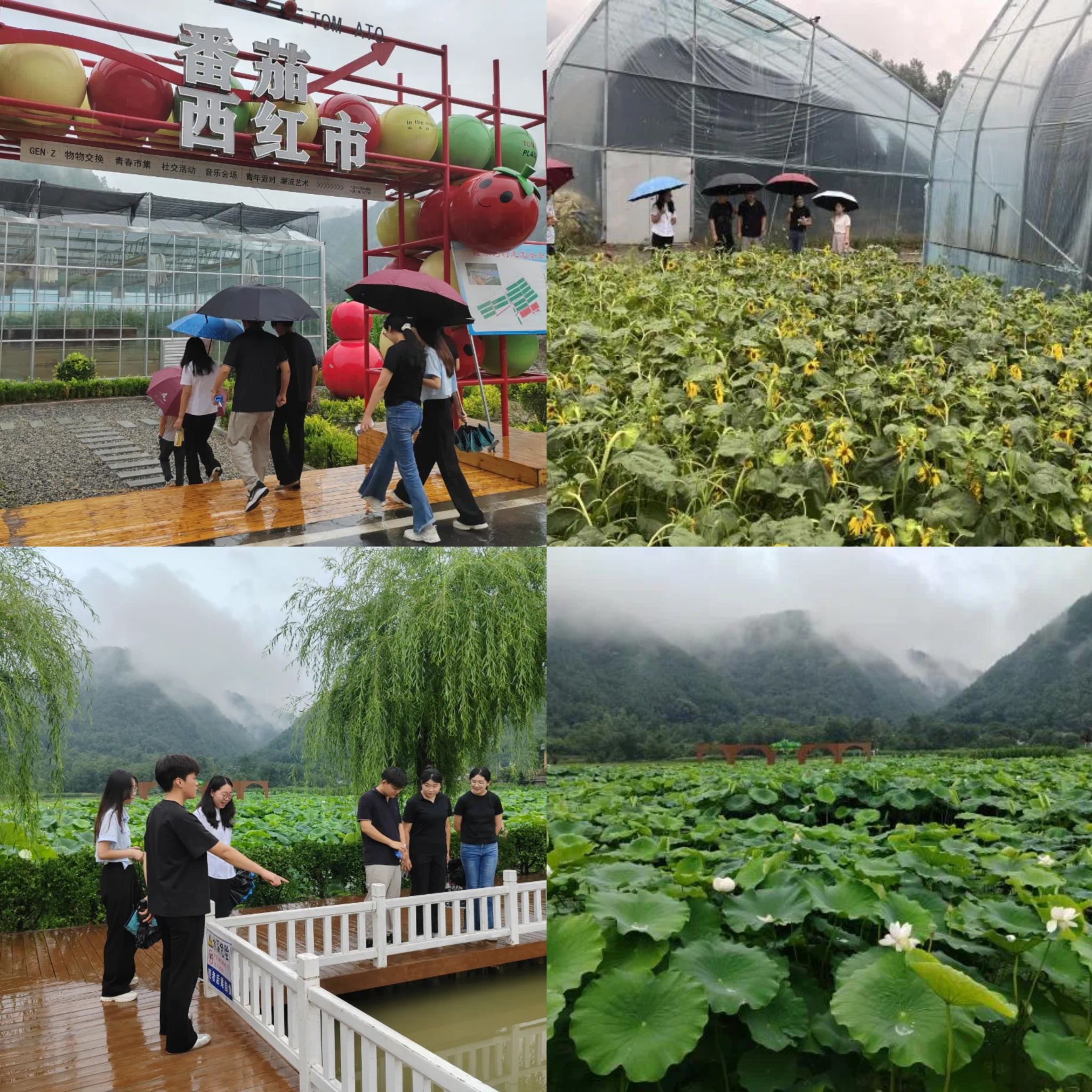 在陆家湾村西红“市”种植大棚、向日葵花海和荷花养殖基地进行现场调研,与村委会、当地村民交谈,了解陆家湾村的种植产业、种植规模和销售渠道,以及当地村民的外出务工、留守和普通话掌握情况。调研中发现,村民在接待游客时因语言不通略显局促,学生团队设计了旅游接待用语模板,对村民进行了培训。