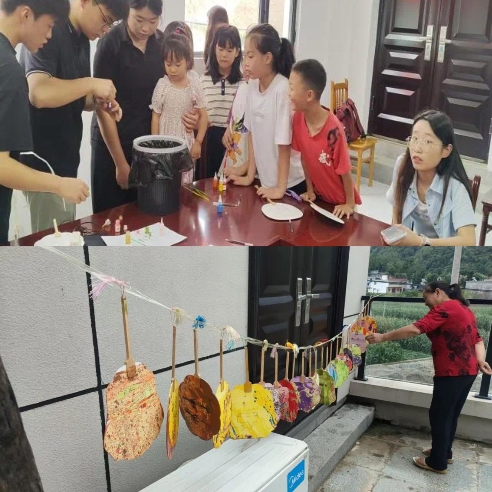 组织“普通话+非遗漆扇”主题活动,40余名当地小朋友参与。团队成员王凯珞作为地道的山阳人,通过“自我介绍”“扇子绘画”“成语接龙”等游戏引导孩子们学说标准普通话。志愿者手把手教孩子们勾勒扇面、调配漆色,引导孩子们结合个人和家乡特色进行创作。活动让孩子们在趣味游戏中提升了语言能力,更通过非遗文化传承,增强了对家乡的认同感。