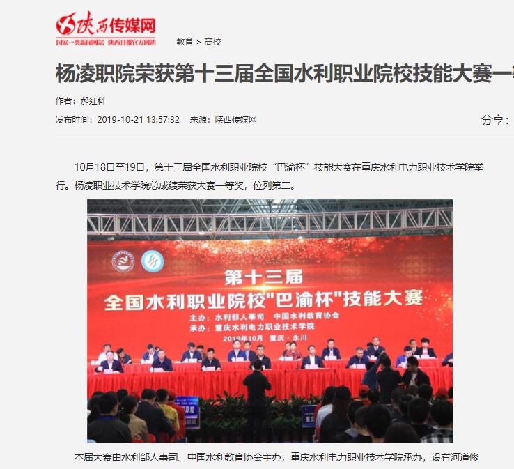 10月18日至19日,第十三届全国水利职业院校“巴渝杯”技能大赛在重庆水利电力职业技术学院举行。杨凌职业技术学院总成绩荣获大赛一等奖,位列第二。