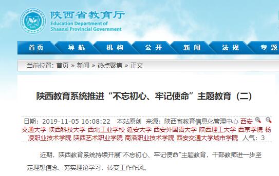 【杨凌职业技术学院】根据杨凌职业技术学院“不忘初心、牢记使命”主题教育安排,10月9日下午,该院党委书记陈宁以《以思政教育筑牢大学生成长成才根基》为题,为党员干部和全体思政课教师上了一堂生动的专题党课。该院党委副书记、院长王周锁主持党课。陈宁结合个人学习、工作和经历,用翔实的数据、典型的案例,围绕如何使思政教育真正促进学生成长成才,从高校思政教育面临的现状、深入推进“课程思政”建设、系统设计学院思政工作三个方面作了深入浅出的讲解。就全面落实“立德树人”根本任务,进一步开展好学院思政教育工作,陈宁指出,要坚持教育与自我教育相结合、坚持政治理论与社会实践相结合、坚持解决思想问题与解决实际问题相结合、坚持知识、能力、素质协调发展与学生社会主义核心价值观塑造相结合、坚持线上与线下教育相结合等。要完善党委统一领导、党政齐抓共管、专兼队伍结合、全院协同配合、学生自我教育的领导体制和工作机制,形成更加规范的思政教育工作管理体系,充分发挥思政教育在培养人、塑造人、成就人过程中的重要作用。要根据学生实际情况,结合高职院校的特点,总体设计该院大学生思政教育工作体系,按年级实施阶段性教育,做到重点突出、针对性强、措施有力、方法灵活、讲求实效。