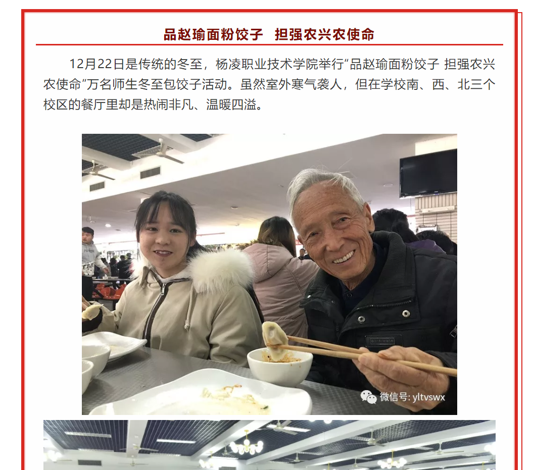12月22日是传统的冬至,杨凌职业技术学院举行“品赵瑜面粉饺子 担强农兴农使命”万名师生冬至包饺子活动。虽然室外寒气袭人,但在学校南、西、北三个校区的餐厅里却是热闹非凡、温暖四溢。