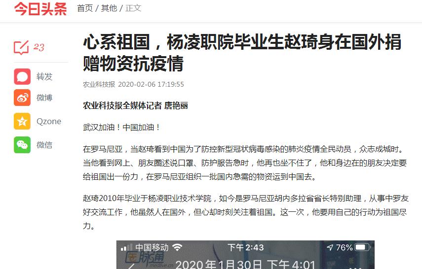 赵琦2010年毕业于杨凌职业技术学院,如今是罗马尼亚胡内多拉省省长特别助理,从事中罗友好交流工作,他虽然人在国外,但心却时刻关注着祖国。这一次,他要用自己的行动为祖国尽力。