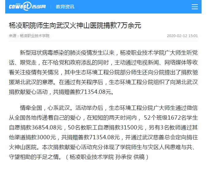 情牵全国,心系武汉。活动举办后,生态环境工程分院广大师生通过微信从全国各地传递着自己的爱心,在短短的两天时间内, 52个班级1672名学生自愿捐款36854.08元,50名教职工自愿捐款31500元,另有3名教师通过其他渠道捐款3000元,共捐赠善款71354.08元,并通过武汉慈善总会定向捐往火神山医院。本次捐款献爱心活动充分体现了学院师生与灾区人民患难与共、守望相助的手足之情。(杨凌职业技术学院 孙承俊 供稿)