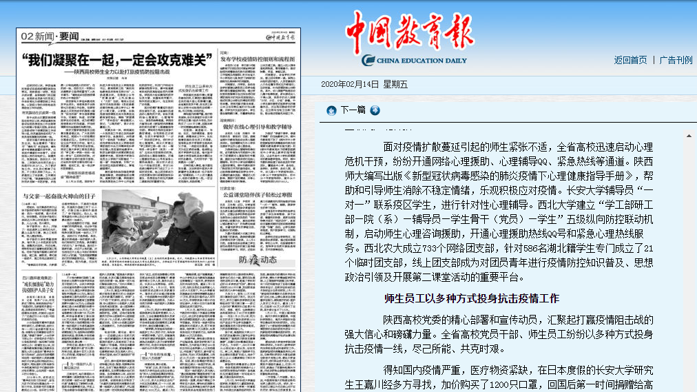 高校宣传战线加强政策措施宣传解读,持续振奋师生精神,凝聚抗疫力量。陕西高校网络思想政治工作中心开设高校抗疫专栏,利用门户网站与新媒体矩阵平台,集中报道教育系统抗疫典型经验和先进事迹。陕西师大组织撰写抗疫评论员文章、拍摄电视专题片、制作抗疫主题MV,在互联网广泛传播。