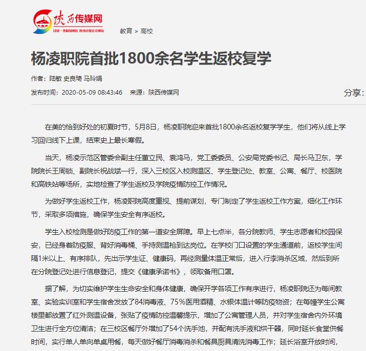 【陕西传媒网】杨凌职院首批1800余名学生返校复学