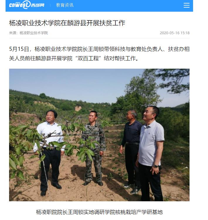 2020年5月15日,杨凌职业技术学院院长王周锁带领科技与教育处负责人、扶贫办相关人员前往麟游县开展该院“双百工程”结对帮扶工作。