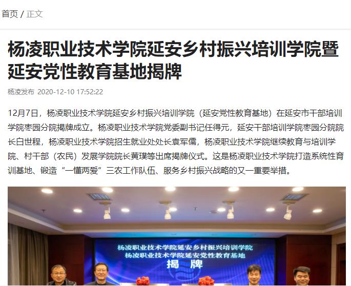 在谈到成立延安乡村振兴培训学院和延安党性教育基地的意义时,杨凌职业技术学院继续教育与培训学院负责人说,延安在党性教育方面具有天然禀赋,具有较强的品牌效应和鲜明的教育主题,在延安成立学院和基地,旨在进一步加强三农基层党员干部党性教育,切实增强基层党组织活动的针对性、生动性和实效性,创新育训形式,拓展育训平台,用活育训资源,丰富思想政治工作的方法和途径。延安乡村振兴培训学院,将在汲取红色文化,发挥职教优势,传承延安精神,进一步履行职业院校育训结合的法定职责等方面做贡献。学院将切实以党建引领乡村振兴,把论文写在三秦大地上,并通过延安这块红色的土地把杨凌农科教优势资源传播到西北乃至全国,为全面建设社会主义现代化国家贡献力量。