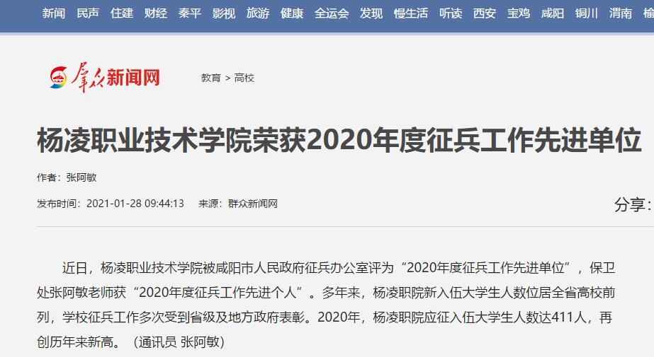 【群众新闻网】杨凌职业技术学院荣获2020年度征兵工作先进单位