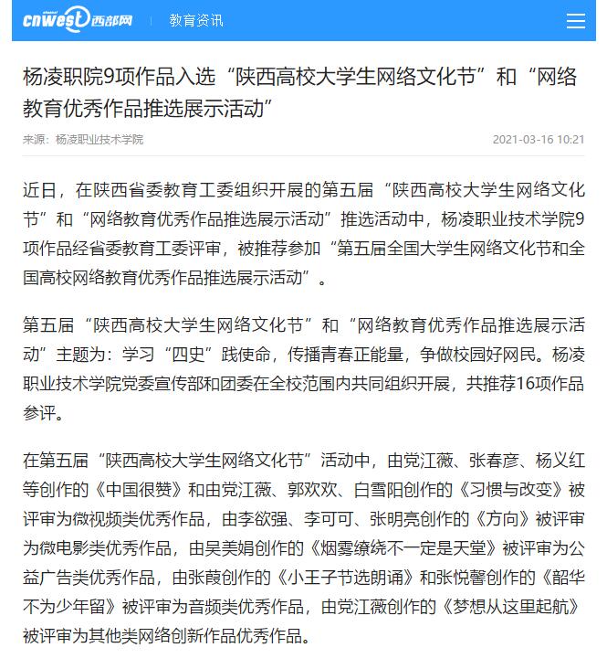 第五届“陕西高校大学生网络文化节”和“网络教育优秀作品推选展示活动”主题为:学习“四史”践使命,传播青春正能量,争做校园好网民。杨凌职业技术学院党委宣传部和团委在全校范围内共同组织开展,共推荐16项作品参评。