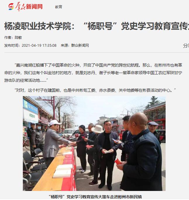 为庆祝中国共产党成立100周年,让党史学习教育深入千家万户,4月14日,杨凌职业技术学院“学习百年党史 筑梦乡村振兴”——“杨职号”党史学习教育宣传大篷车走进彬州市新民镇,受到了当地村民的热烈欢迎。