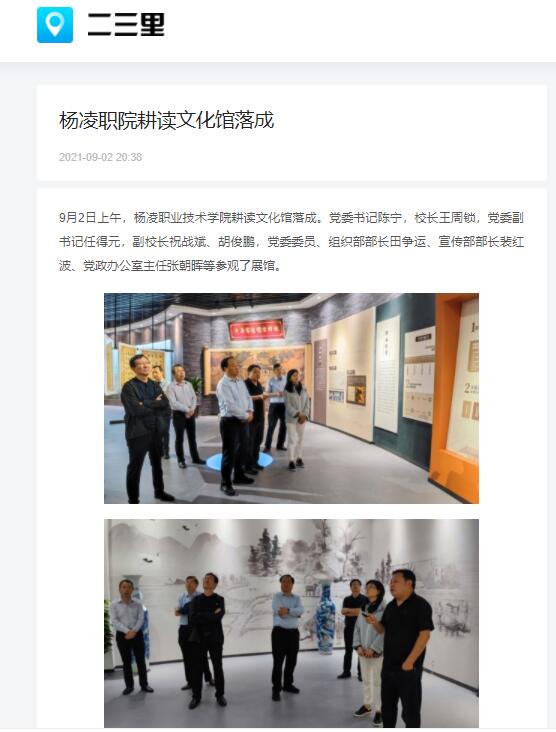 9月2日上午,杨凌职业技术学院耕读文化馆落成。党委书记陈宁,校长王周锁,党委副书记任得元,副校长祝战斌、胡俊鹏,党委委员、组织部部长田争运、宣传部部长裴红波、党政办公室主任张朝晖等参观了展馆。