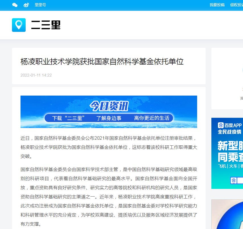 近日,国家自然科学基金委员会公布2021年国家自然科学基金依托单位注册审批结果,杨凌职业技术学院获批为国家自然科学基金依托单位,这标志着该校科研工作取得重大突破。