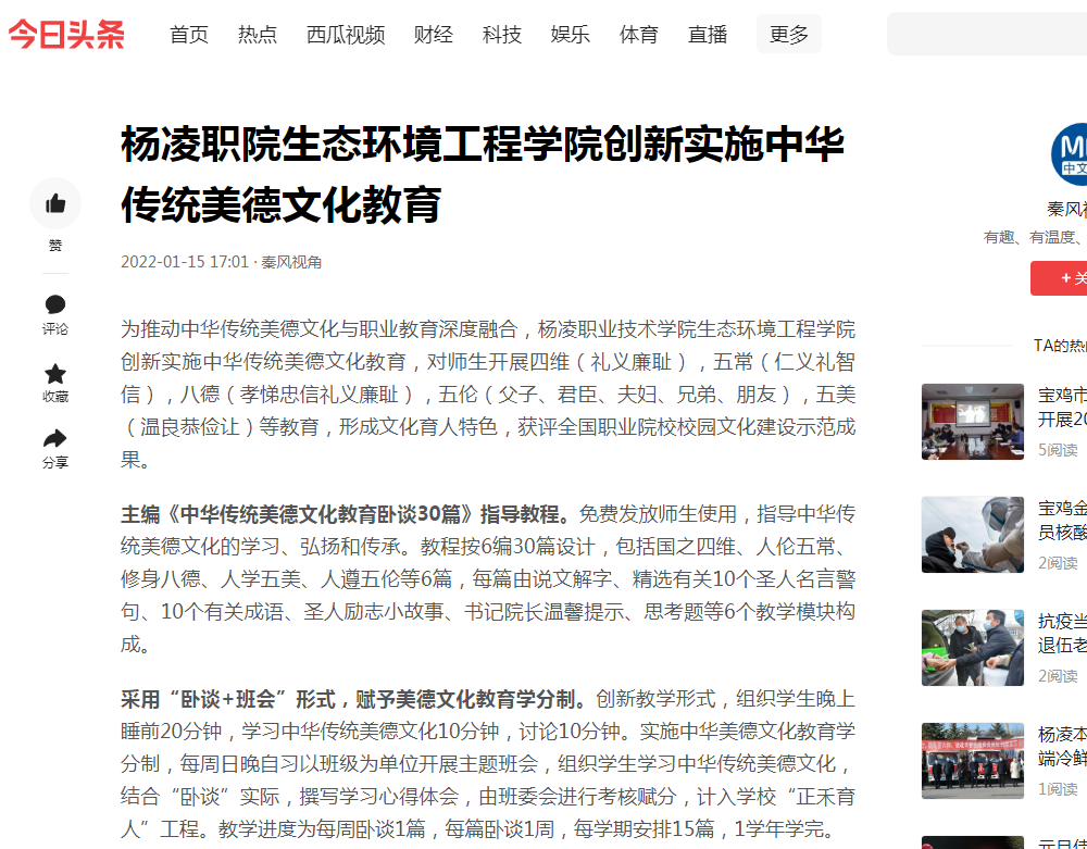 为推动中华传统美德文化与职业教育深度融合,杨凌职业技术学院生态环境工程学院创新实施中华传统美德文化教育,对师生开展四维(礼义廉耻),五常(仁义礼智信),八德(孝悌忠信礼义廉耻),五伦(父子、君臣、夫妇、兄弟、朋友),五美(温良恭俭让)等教育,形成文化育人特色,获评全国职业院校校园文化建设示范成果。