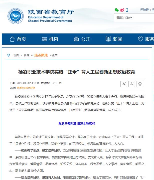 【陕西省教育厅】热点聚焦:杨凌职业技术学院实施“正禾”育人工程 创新思想政治教育