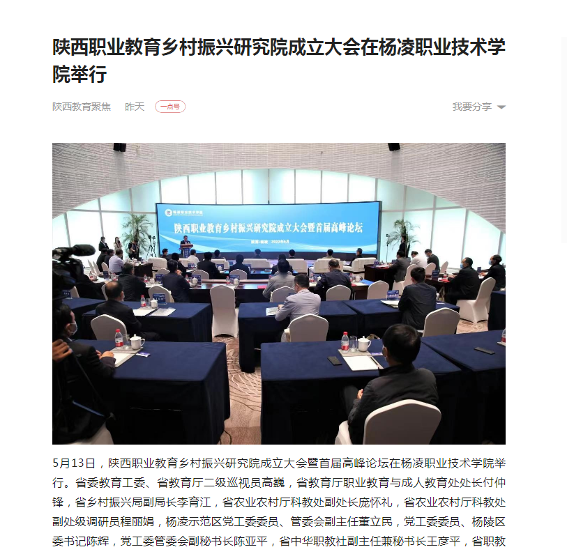 批复指出,陕西职业教育乡村振兴研究依托杨凌职业技术学院成立,为独立运行的学术研究机,陕西职业教育构,要面向“三农”,积极开展理论研究,构建“产教融合、科教协同、校际共享、校地一体”的运行机制。研究院要通过开展理论研究、咨询服务、学术交流等,探索职业教育服务乡村振兴战略新路径,创新职业教育产教融合新模式,努力将研究院打造为高水平理论研究基地,为提升职业教育服务乡村振兴战略和经济社会发展能力做出新的贡献。