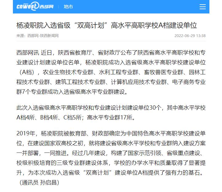 近日,省教育厅、省财政厅公布了陕西省高水平高职学校和专业建设计划建设单位名单,杨凌职业技术学院成功入选省级高水平高职学校建设单位(A档),农业生物技术专业群、水利工程专业群、畜牧兽医专业群、园林工程技术专业群、建筑工程技术专业群、计算机应用技术专业群、电子商务专业群7个专业群成功入选省级高水平专业群建设。
