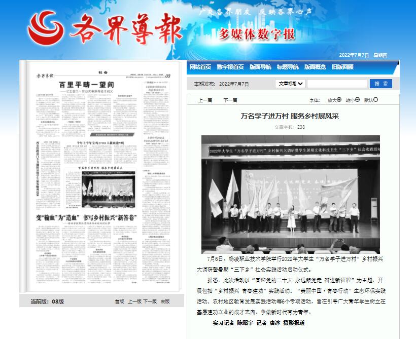 7月6日,杨凌职业技术学院举行2022年大学生“万名学子进万村”乡村振兴大调研暨暑期“三下乡”社会实践活动启动仪式。