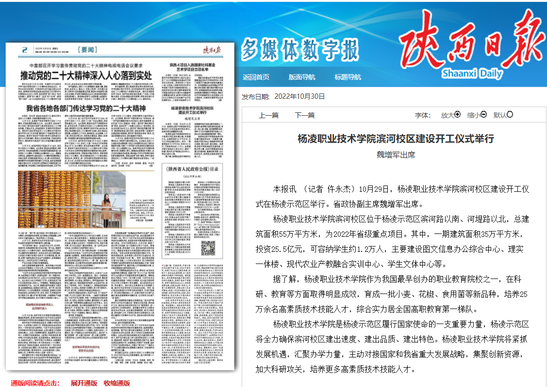 本报讯 (记者 仵永杰)10月29日,杨凌职业技术学院滨河校区建设开工仪式在杨凌示范区举行。省政协副主席魏增军出席。