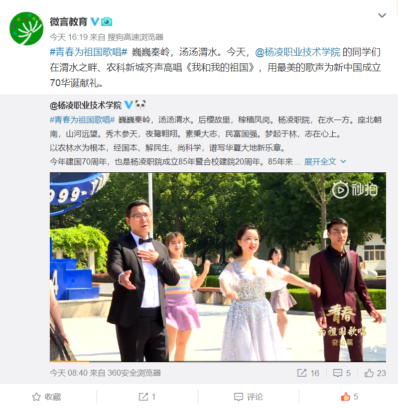 【教育部新闻办公室官方微博】杨凌职业技术学院师生齐声高唱“我和我的祖国”