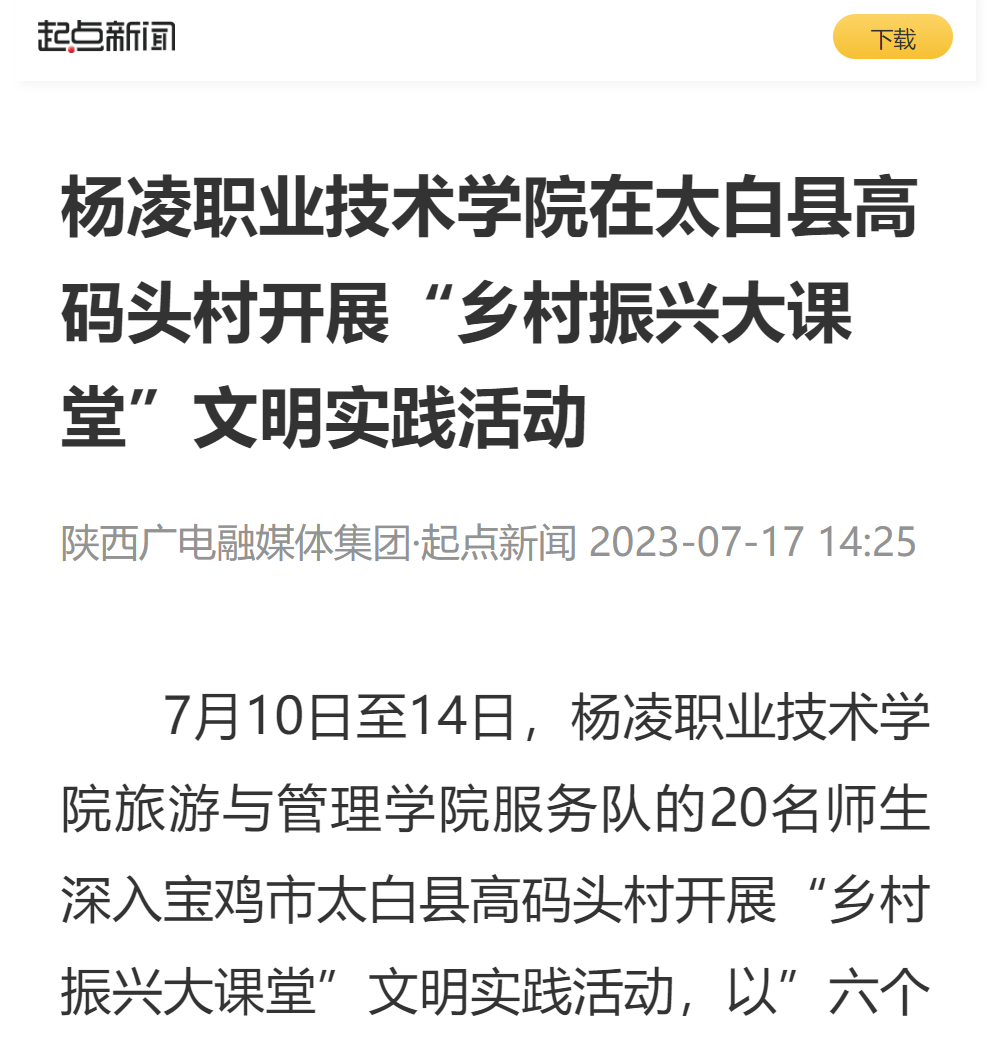 7月10日至14日,杨凌职业技术学院旅游与管理学院服务队的20名师生深入宝鸡市太白县高码头村开展“乡村振兴大课堂”文明实践活动,以”六个一”方式将思政小课堂融入社会大课堂,助力高码头村在产业兴旺、生态宜居、乡风文明、治理有效、生活富裕等方面取得新成绩。