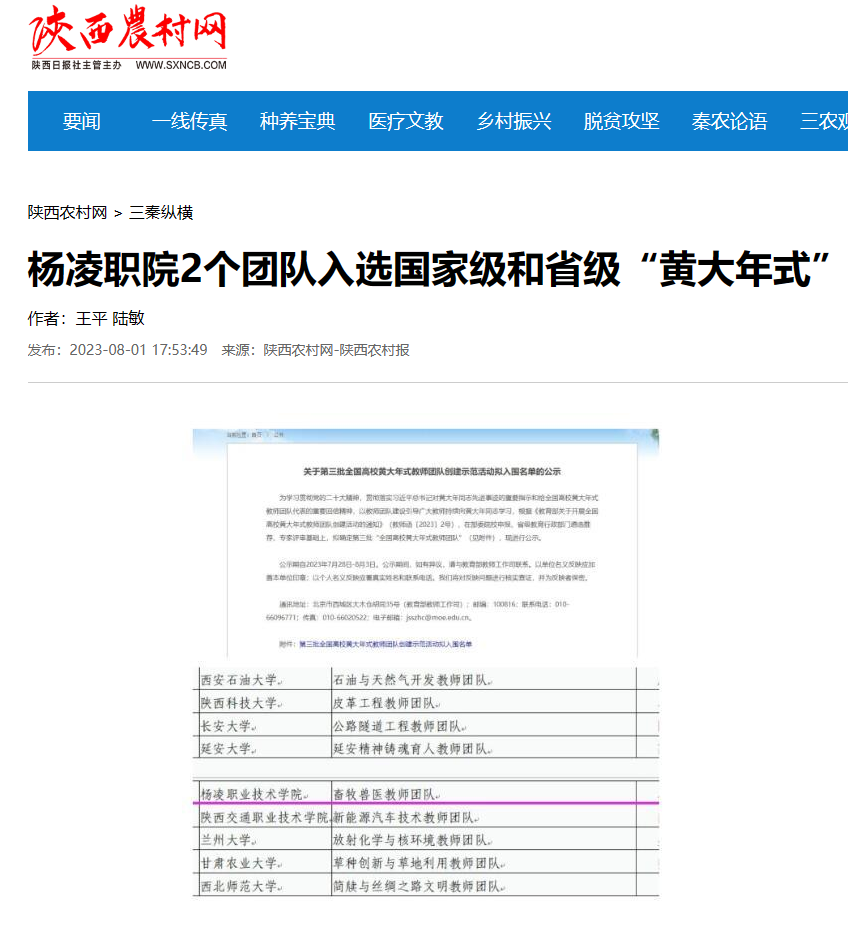【陕西农村网】杨凌职院2个团队入选国家级和省级“黄大年式”教师团队