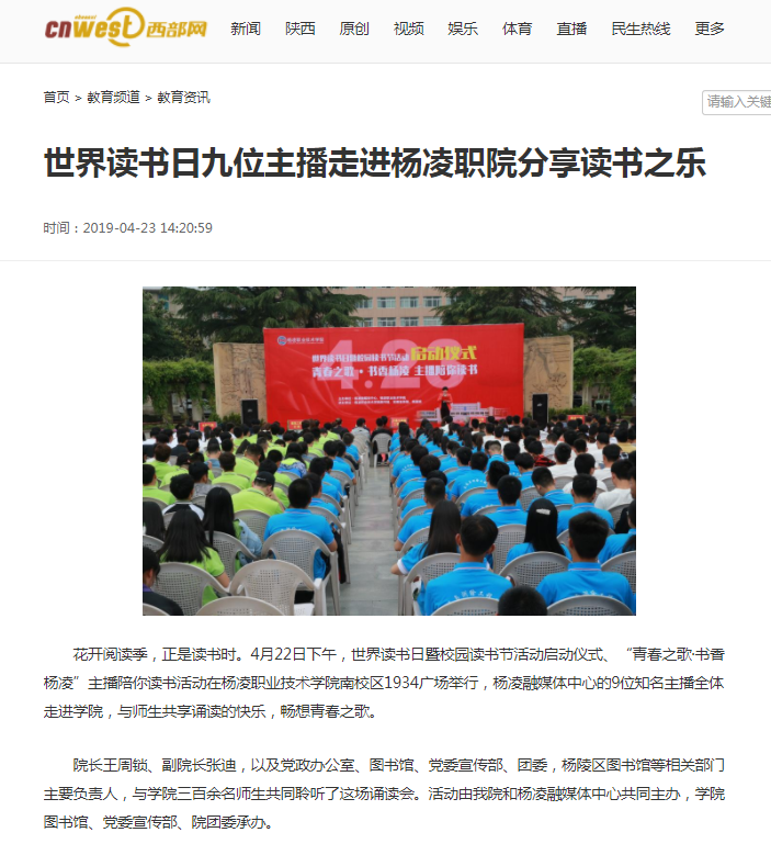 花开阅读季,正是读书时。4月22日下午,世界读书日暨校园读书节活动启动仪式、“青春之歌·书香杨凌”主播陪你读书活动在杨凌职业技术学院南校区1934广场举行,杨凌融媒体中心的9位知名主播全体走进学院,与师生共享诵读的快乐,畅想青春之歌。