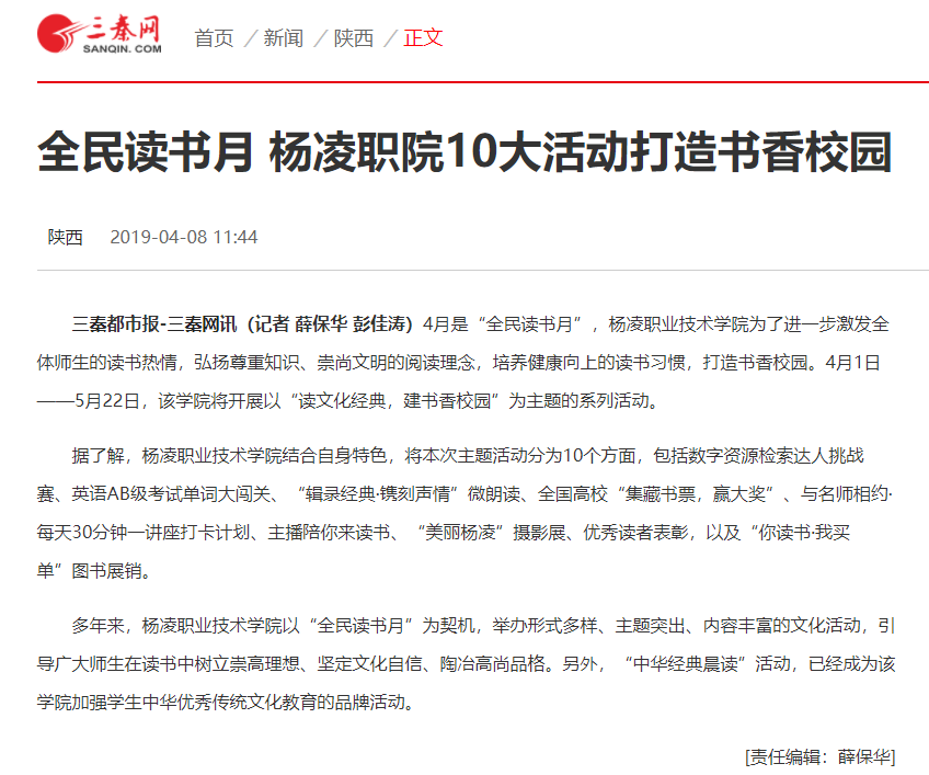 【三秦都市报】全民读书月 杨凌职院10大活动打造书香校园