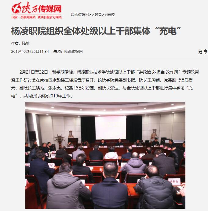 2月21日至22日,新学期伊始,杨凌职业技术学院处级以上干部“讲政治 敢担当 改作风”专题教育暨工作研讨会在南校区水韵楼二楼报告厅召开。该院学院党委副书记、院长王周锁,党委副书记任得元,副院长王晓地、张永良,纪委书记刘粉莲,副院长张迪,与全院处级以上干部进行集中学习“充电”,共同研讨学院2019年工作。