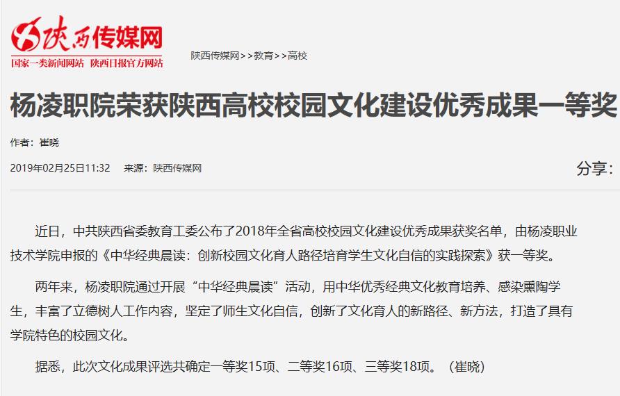 近日,中共陕西省委教育工委公布了2018年全省高校校园文化建设优秀成果获奖名单,由杨凌职业技术学院申报的《中华经典晨读:创新校园文化育人路径培育学生文化自信的实践探索》获一等奖。