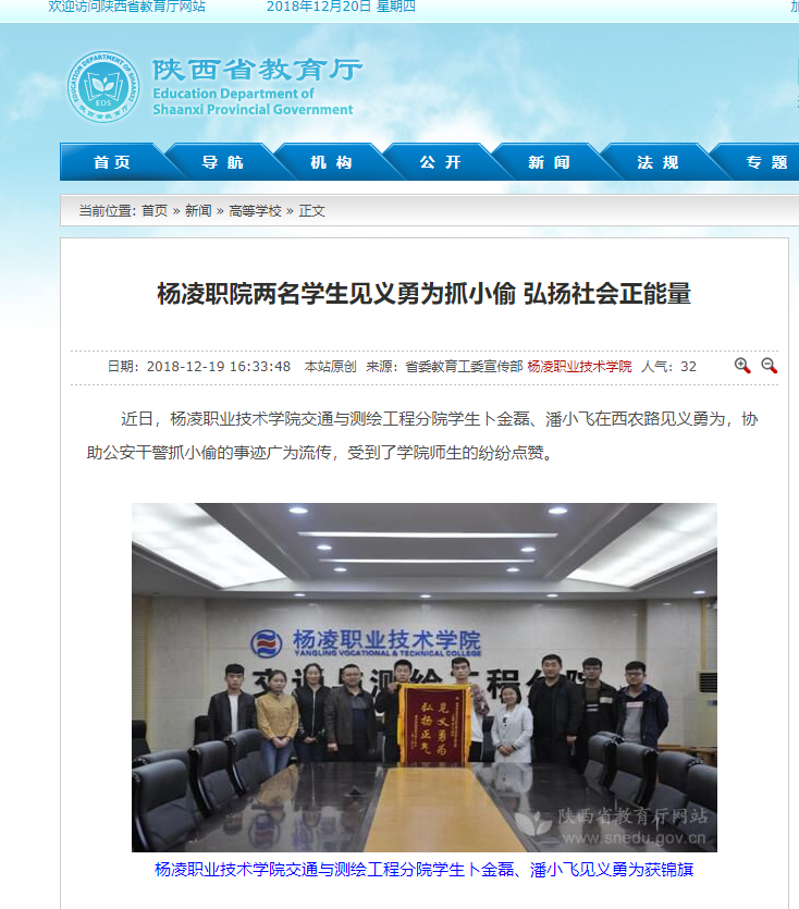近日,杨凌职业技术学院交通与测绘工程分院学生卜金磊、潘小飞在西农路见义勇为,协助公安干警抓小偷的事迹广为流传,受到了学院师生的纷纷点赞。